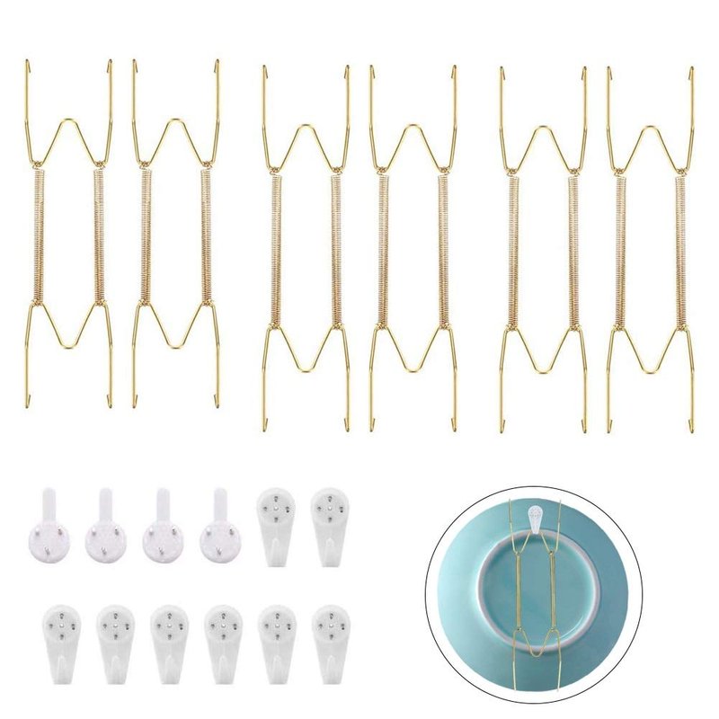 Perfect fit for decorative plates, antique plates and art. Flexible for decorating porch, wall and holding plates, easy to use and holds the plate securely to the wall.It only takes a few minutes to finish the decorative what you want. Specifications: Material: Brass Color: Gold Size: 6/ 8 /10 Inch plate hangers, small, middle wall hooks. Small wall hooks can carry 6.6 pounds. Middle wall hooks can carry 11 pounds. 6 Inch fit for holding 5.9 to 6.3 Inch round or square plates. 8 Inch fit for holding 7.9 to 8.7 Inch round or square plates. 10 Inch fit for holding 9.4 to 10.2 Inch round or square plates. Installation method: Install the wall hook on the wall. Fix the decorative plates on the wall plate hanger. Finally you can hang the wall plate hanger on the wall hooks. Packaging Includes: 4 Pack x 6 Inch Plate Hangers 4 Pack x 8 Inch Plate Hangers 4 Pack x 10 Inch Plate Hangers 4 x Small Wall Hooks 4 x Middle Wall Hooks Note: Please be sure that you have placed the wall hooks firmly before hanging your plate hangers on it.