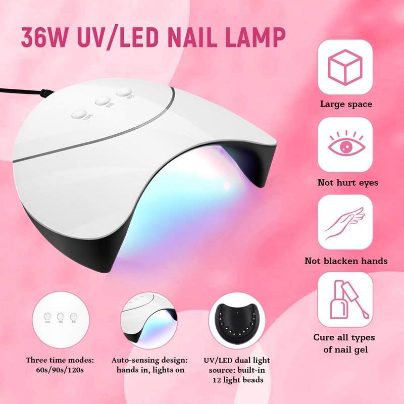 - 【Efficient 36W U V/LED Nail Lamp】 Professional nail dryer in this gel nail polish kit has three time options: 60s/90s/120s, and automatic sensor design, allowing you to easily control the curing of gel nail polish. U V/LED dual light source design, with 12 lamp beads, can efficiently cure almost all kinds of nail gel, not hurt your eyes, not black hands. Enough space to cure a whole hand or foot, bring you high quality nail art curing experience.