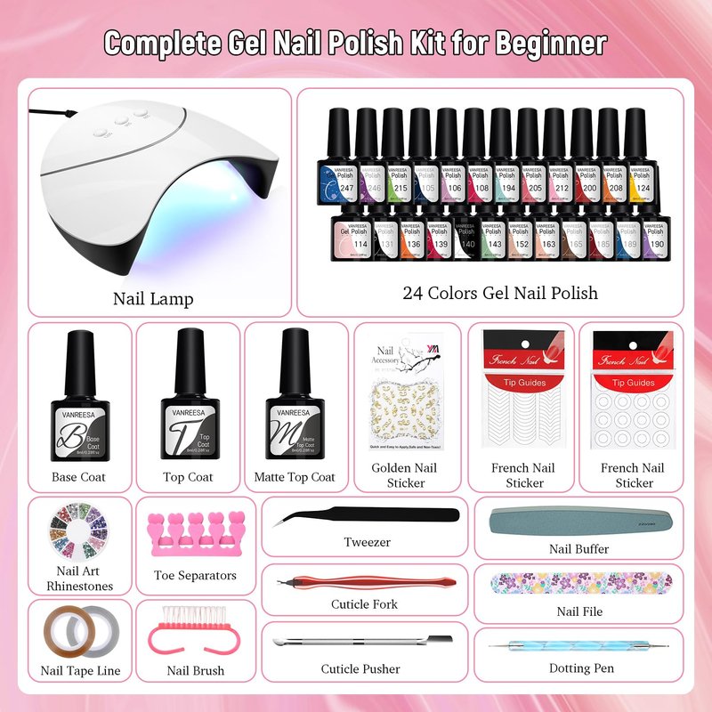 - 【Professional 42 Pcs Gel Nail Kit for Beginners】 VANREESA gel nail polish kit comes in a beautiful gift box and contains 24 bottles of 8ml gel nail polish, 8ml base coat, glossy & matte 8ml top coat, 36W nail lamp, essential manicure tools and some beautiful nail art decorations. This gel nail polish kit with u v light contains all the necessary tools for both professionals and hobbyists to easily enjoy their own manicure at home!