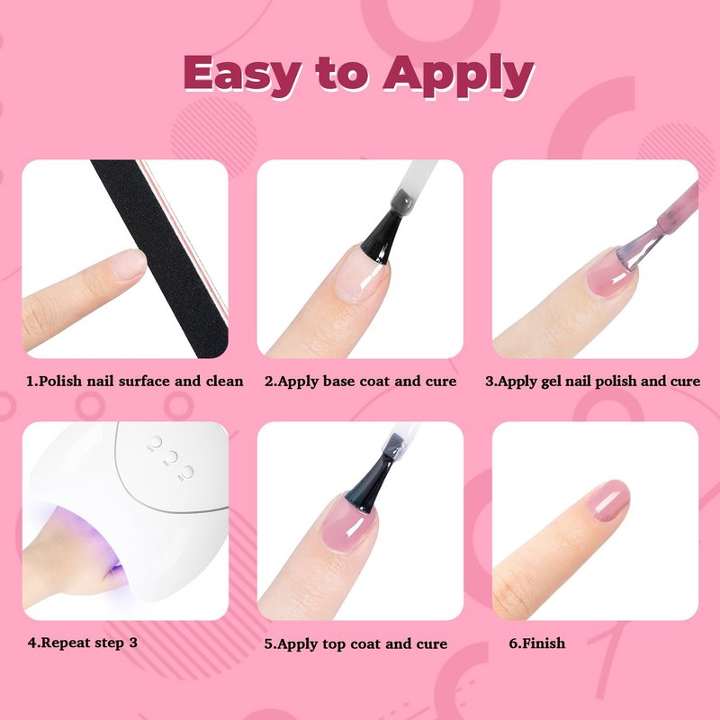 How to use 1.Polish the nail shape with nail file and remove the cuticle with cuticle pusher and cuticle fork. 2.Polish the nail surface with nail buffer, then use nail brush to remove dust from the nail surface. 3.Apply a thin layer of base coat on the nail surface. 4.Cure with nail lamp for 90-120s, don't wipe. 5.Apply a thin layer of gel nail polish and cure with nail lamp. 6.Repeat step 5. 7.Apply a thin layer of top coat/matte top coat and cure with nail lamp. 8.Finish.