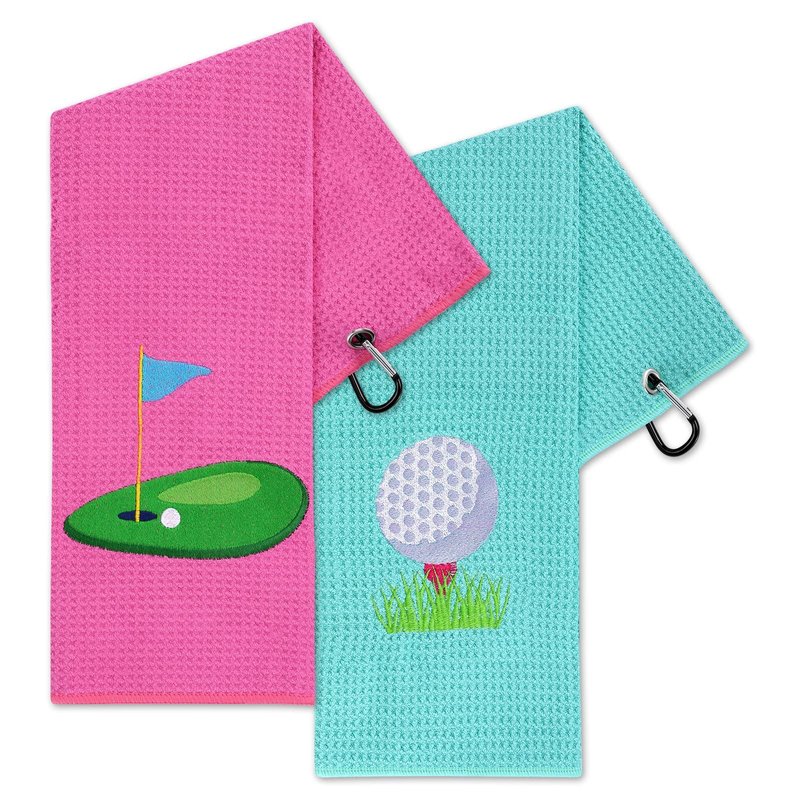 - GOLF TOWELS FOR WOMEN -- The package includes 2pcs waffle pattern microfiber towels feature in two different colors(hot pink and turquoise blue), and you can choose the matching color of golf towel for golf bags, club suits, and your favorite team.