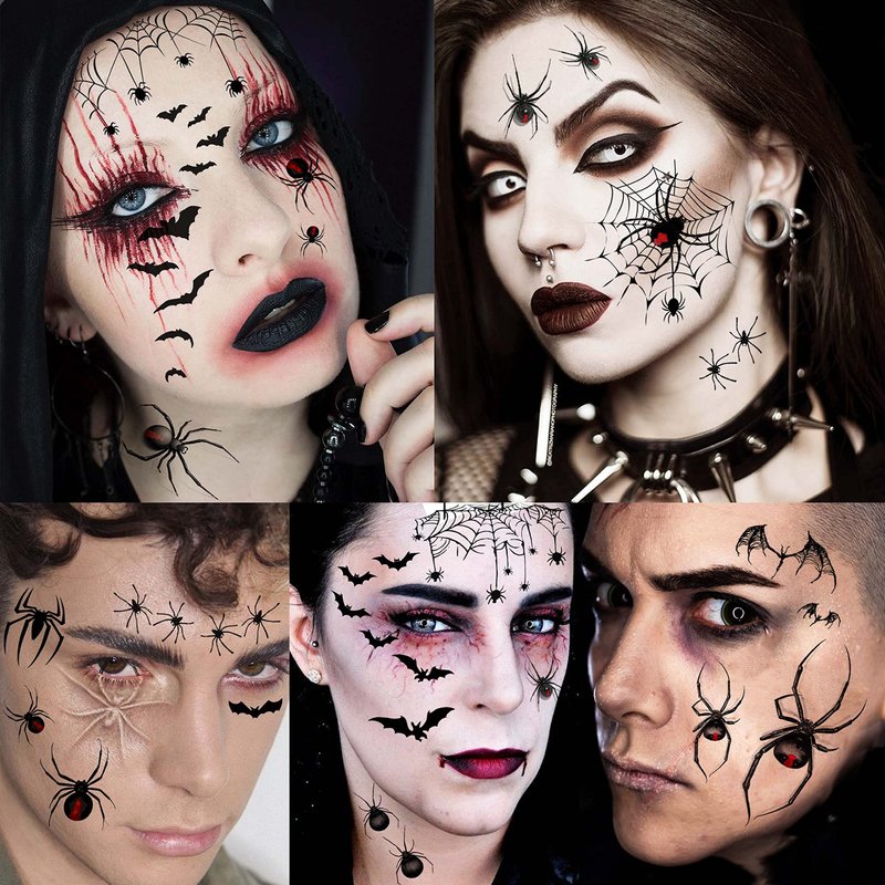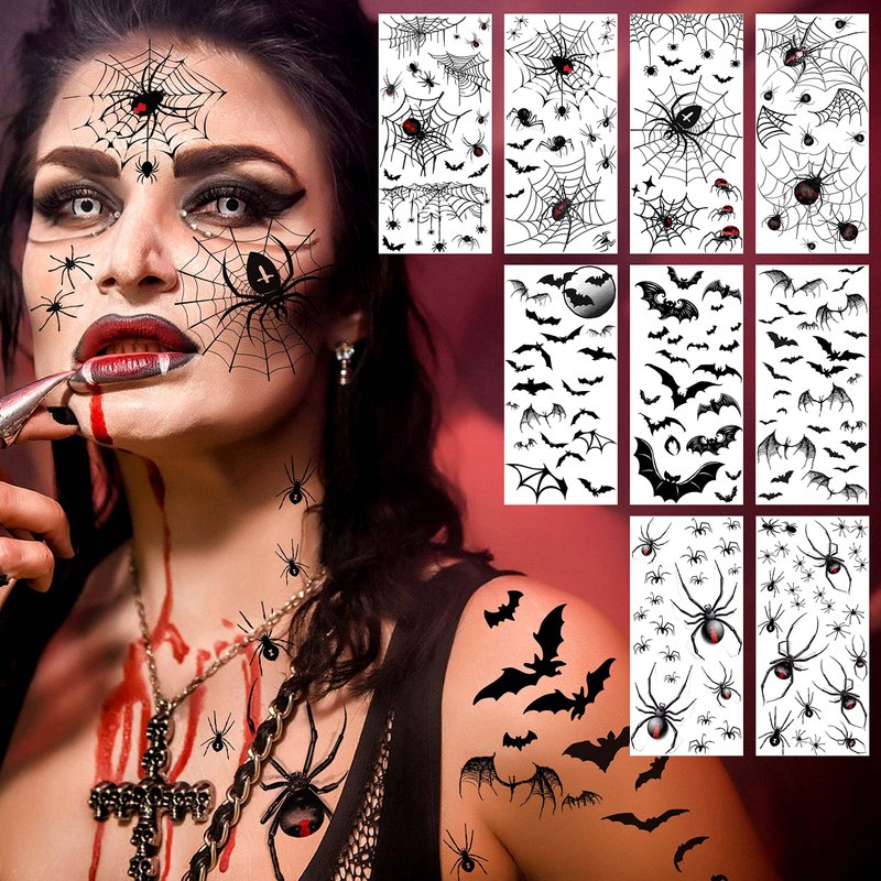 VANTATY 9 Sheets Halloween Spider Web Face Tattoo Stickers, Bat Half Arm Temporary Tattoo Sleeve For Women Men Adults Kids, Scary Spiderweb Witch Makeup for Halloween Face Tattoo, Fake Chucky Zombie Makeup Kit