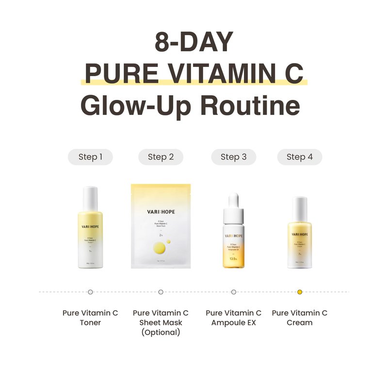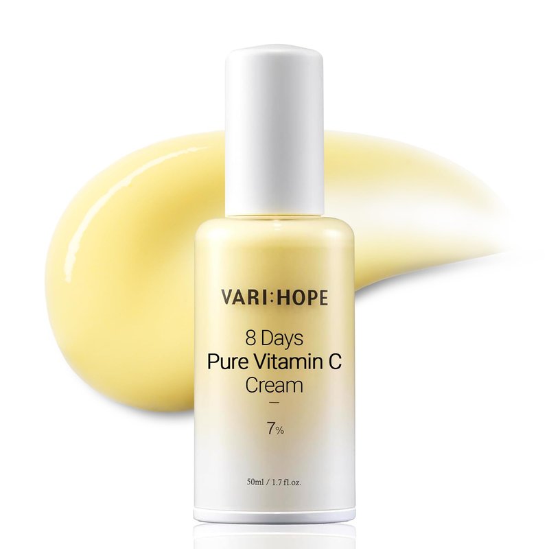 - VARI:HOPE 8 DAYS PURE VITAMIN C CREAM (50ml/1.7fl oz) - Experience a surge of moisture and vibrant skin with our 8 Days Pure Vitamin C Cream packed with 70,000ppm of stabilized vitamin C. This nutrient-rich moisturizer hydrates, nourishes, and leaves your skin glowing with vitality.