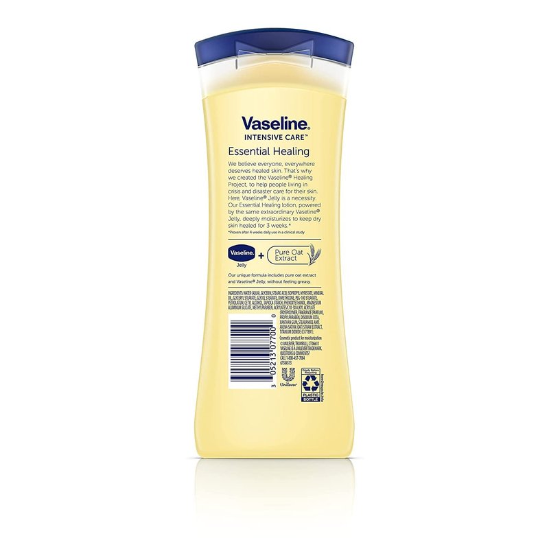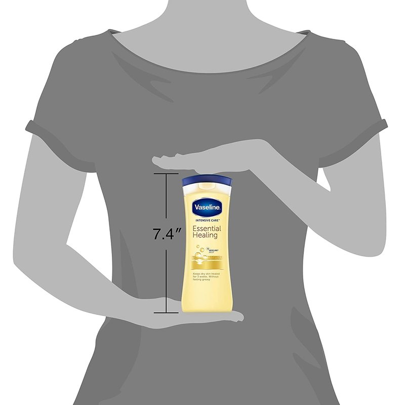 Vaseline Intensive Care Essential Healing Body Lotion The lotion leaves your skin feeling healthy, soft and smooth. Effective, non-greasy, fast absorbing formula leaves skin feeling silky smooth and comfortable. Hydrates and replenishes dry skin. Enriched with vitamin E and minerals to give skin essential moisture where it needs it most.