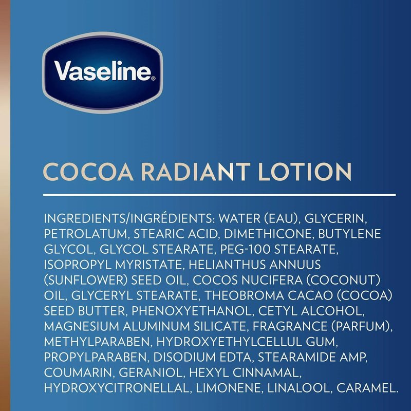 Vaseline Intensive Care Cocoa Radiant Lotion is infused with real cocoa butter that helps rejuvenate dull, dry skin, it's like a tropical vacation for your skin, minus the plane ticket. This dermatologist-tested lotion is designed to help keep your skin looking healthy and radiant.