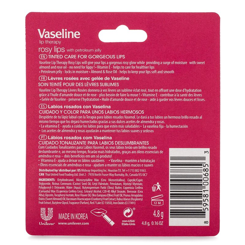 Vaseline Lip Therapy Rosy Lips with petroleum jelly provide essential moisture for healthy lips. Packaged in a convenient 2-pack, this Vaseline lip balm stick contains Vaseline petroleum jelly to give our lips the essential moisture they need to look and feel healthy. Use every day to soothe dry, chapped lips. Grab a stick for on-the-go to treat dry, peeling, or cracked lips.