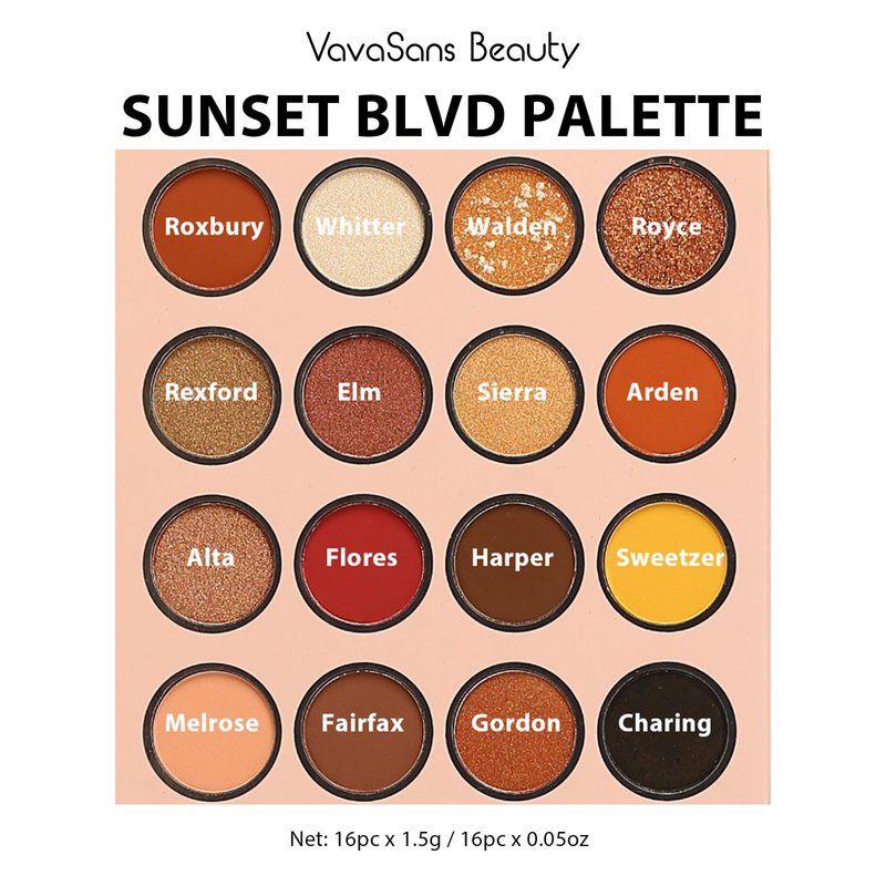 VavaSans Sunset Blvd Eyeshadow Palette 16 Colors Brown Nude Earth Tone Matte Glitter Shimmer Eye Shadow Long Lasting High Pigmented Blendable Smokey Eyeshadow Powder Makeup