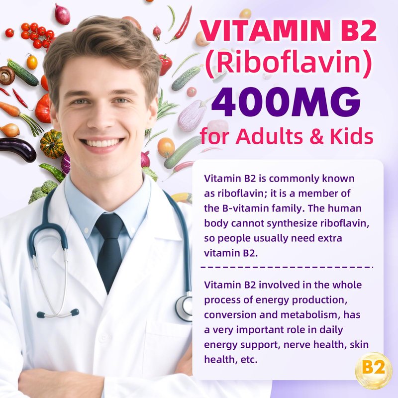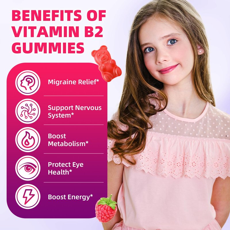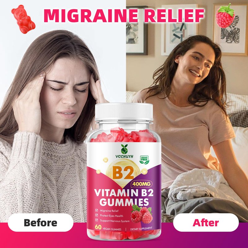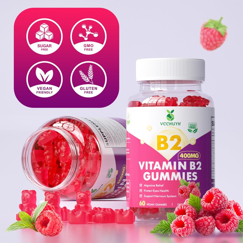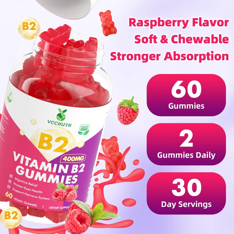 VCCHUYH Vitamin B2 Gummies for Kids & Adults, VIT B2 Riboflavin 400mg Supplement with Magnesium for Migraine Relief & Nervous System Support, Non-GMO, Vegan, Raspberry Flavor 60 Count