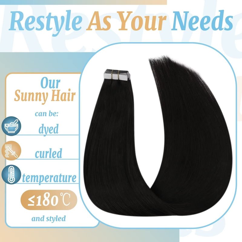 - 3. Important tips: Ve Sunny human hair extensions tape in jet black is made from 100% remy human hair, which is soft and silky with healthy shine, no tangle and shedding. They can be straightened, curled, washed and dyed,when you straighten or curl the hair,we recommend the temperature under 180?,it could ensure the lifespan of hair.