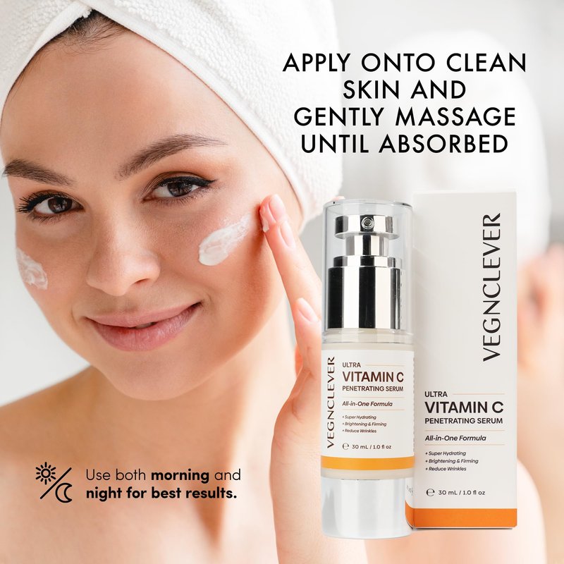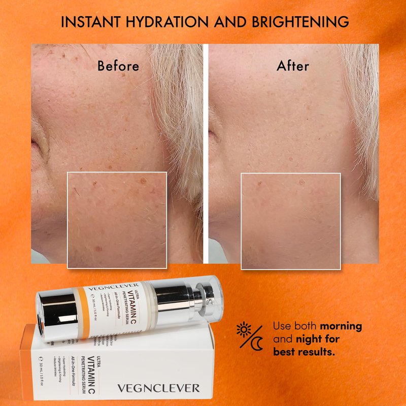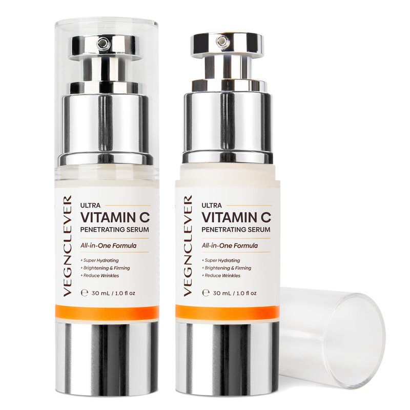VegnClever Ultra Vitamin C Super Serum - All-in-One Formula Penetrating Serum with Niacinamide, Collagen Peptides, Caffeine, and Vitamin E, Original Vitamin C Face Serum. This Vitamin C Serum is created with care for women over 50. The age-defying formula is a gentle fusion of wholesome ingredients, including Niacinamide, Vitamin C, Collagen Peptide, Vitamin E, and Hydroxy Acid (AHA). This powerhouse serum ensures swift absorption, offering deep moisturization without any sticky residue, leaving your skin pleasantly refreshed and revitalized. To the skincare needs of women over 70, our serum targets wrinkles, fine lines, and age spots, fostering a smoother and more radiant complexion. The unique active lock delivery system facilitates rapid absorption, forming a nurturing reservoir for enduring benefits. Enriched with ascorbic acid polypeptide, our Vitamin C serum long-lasting formula ensures improved absorption and caters to sensitive skin. Embrace 24-hour moisturization, witnessing visible skin texture and tone enhancements within just two weeks. Make this serum a cherished part of your daily skincare ritual—apply it to your cleansed face and neck both morning and night. Experience a kinder approach to skincare with our Vitamin C Super Serum, where friendliness meets effectiveness, creating a delightful path to a revitalized and glowing you. Some Active Ingredients: JOJOBA OIL (SIMMONDSIA CHINENSIS SEED OIL), NIACINAMIDE (VITAMIN B3), ALPHA-ARBUTIN, PANTHENOL (VITAMIN B5), HYALURONIC ACID, SQUALANE, ADENOSINE, CAFFEINE, CERAMIDES (CERAMIDE NS/CERAMIDE NG), MULTIPLE PEPTIDES(PALMITOYL TRIPEPTIDE-5, ACETYL HEXAPEPTIDE-8, ARGININE/LYSINE POLYPEPTIDE, PALMITOYL TRIPEPTIDE-1, PALMITOYL TETRAPEPTIDE-7), BIFIDA FERMENT FILTRATE, LICORICE EXTRACT (GLYCYRRHIZA GLABRA EXTRACT), ALLANTOIN, RETINYL PALMITATE(A SYNTHETIC FORM OF VITAMIN A)