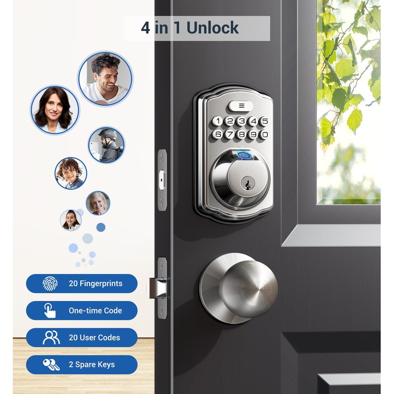 - [4 in 1] Unlock: 20 fingerprints+20 passwords+2 spare keys for family use+one-time password for temporary visitors, the one-time password will be automatically deleted after use.