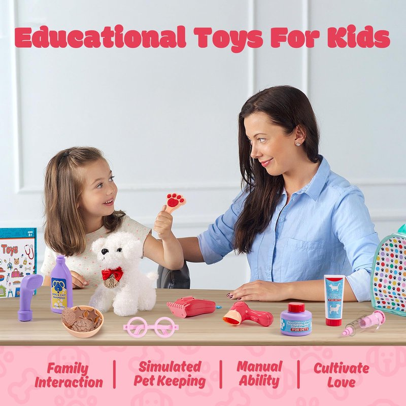 - š¶ćRich Pretend Play ExperiencećWith this set of pet care toys, kids will experience the daily activities of raising a pet. Sick care, feeding, bathing, hairdressing and more. It is conducive to cultivating children's love and patience, so that they can really take good care of their beloved pets in the future.