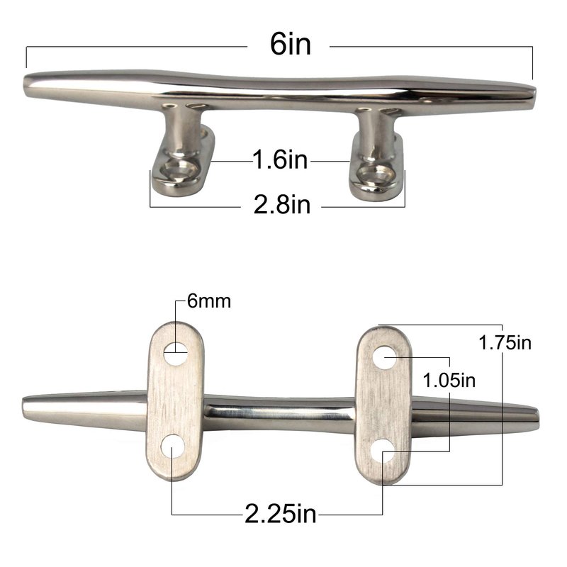 - 【Stainless Cleat Size & With Fasteners 】These dock boat cleats 6 inch L x 1-1/8 inch H;base measures 1.75-inch x 0.6-inch; mounting holes 2.25 inch center to center. stainless boat cleat with hardware: M6 x 30mm (1.18in) stainless steel screws, perfect size to fit any use. rope cleats for boats are professional grade open-based cleats that are great for use on deck and piers.