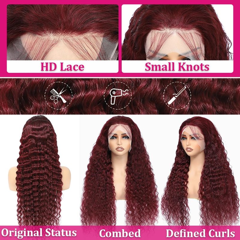 - 99J Burgundy Deep Wave Lace Front Wigs Human Hair Lace: Deep Wave HD Lace Front Wigs Human Hair Nude See Through Transparent Invisible No Red-Dye Tinted, Lace Melt Easily, Blend In Any Skin Tone, Wet And Wavy Human Hair Wigs For Black Women Ate Up