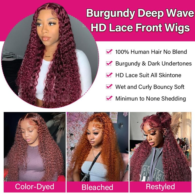 - Burgundy Deep Wave Lace Front Wigs Human Hair Material: The Burgundy Wig Made By 100% Unprocessed Wigs Human Hair Cut From Young Donor,180% Density Soft Curl Patterns With Dark Burgundy Colored At Low Maintanance, Can Be Dyed,Restyled,Bleached Times