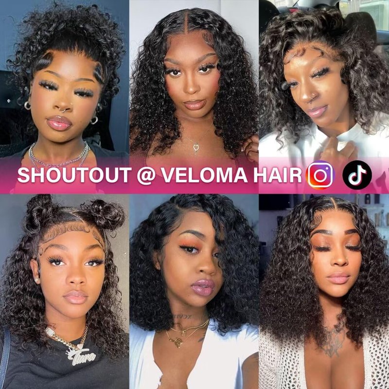 VELOMA Deep Wave Bob Wig Human Hair 13x4 Hd Lace Front Wig For Women Pre Plucked With Baby Hair 180% Density Short Curly Bob Deep Wave Lace Front Wigs Human Hair Super Soft 10inch