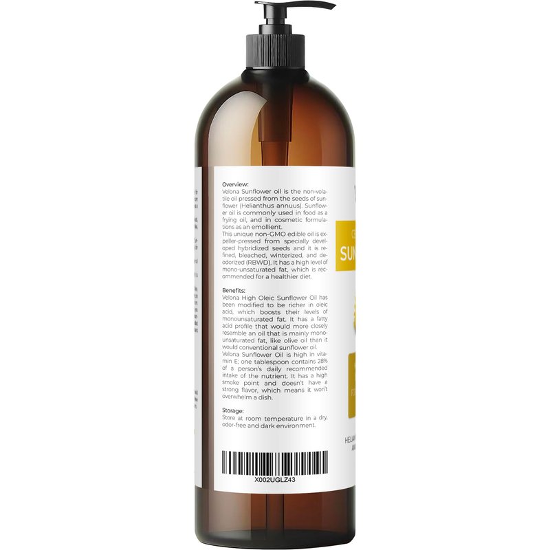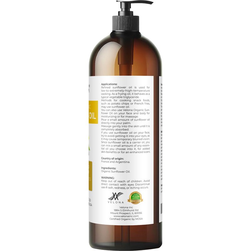 velona USDA Certified Organic Sunflower Oil - 32 fl oz | 100% Pure and Natural Carrier Oil | High Oleic, Refined, Expeller Pressed | Cooking, Skin, Hair, Body & Face Moisturizing