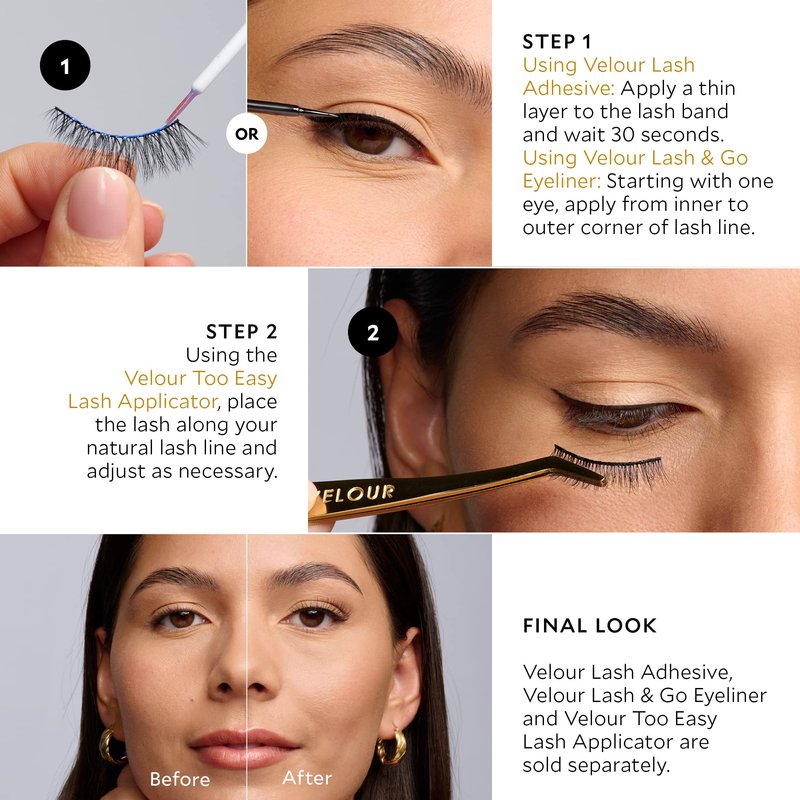 - EASY TO USE: Apply using Velour Lash Adhesive or Velour Lash & Go Eyeliner. Place the lash as close to your natural lash line as possible, on the outer three-quarters of the eye.