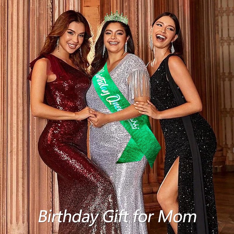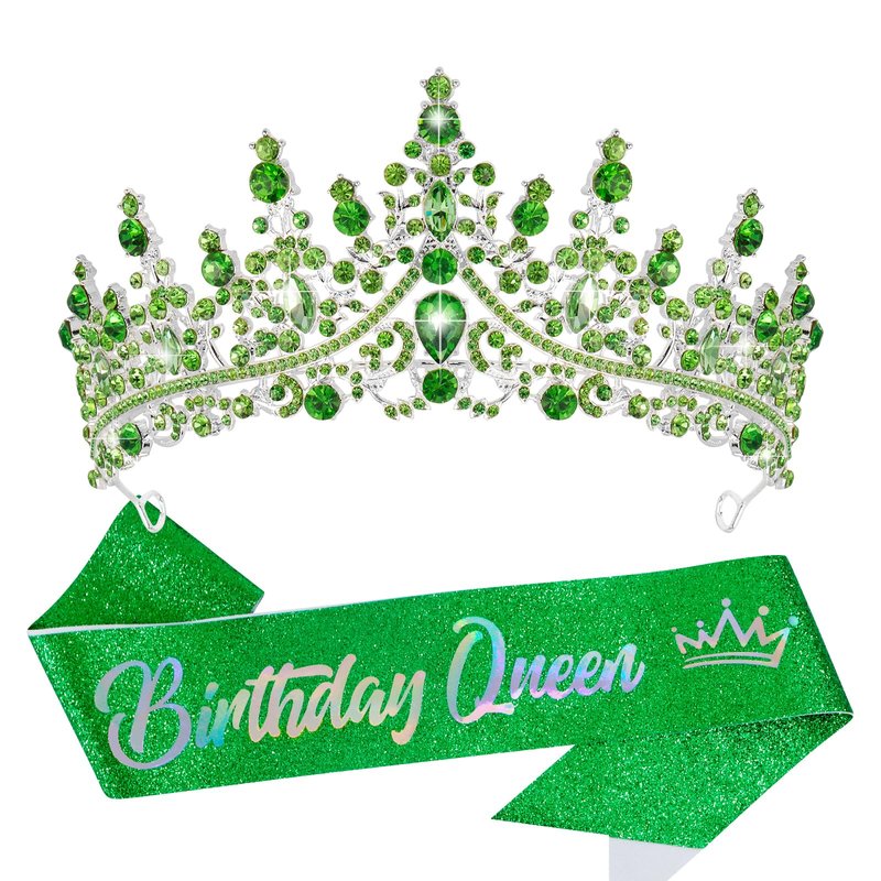 VELSCRUN Birthday Queen Tiara Crowns for Women Girls Green Crystal Birthday Queen Headband Sash Elegant Princess Crown Happy Birthday Party Decorations Mom Sisters Birthday Gift Hair Accessories