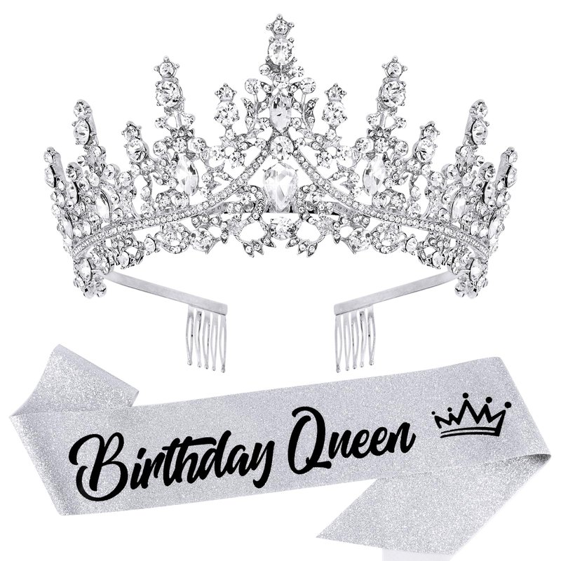 VELSCRUN Silver Crystal Birthday Queen Tiara Crowns for Women Girls Birthday Queen Headband Sash Elegant Princess Crown with Combs Hair Accessories Happy Birthday Party Decorations Mom Birthday Gift