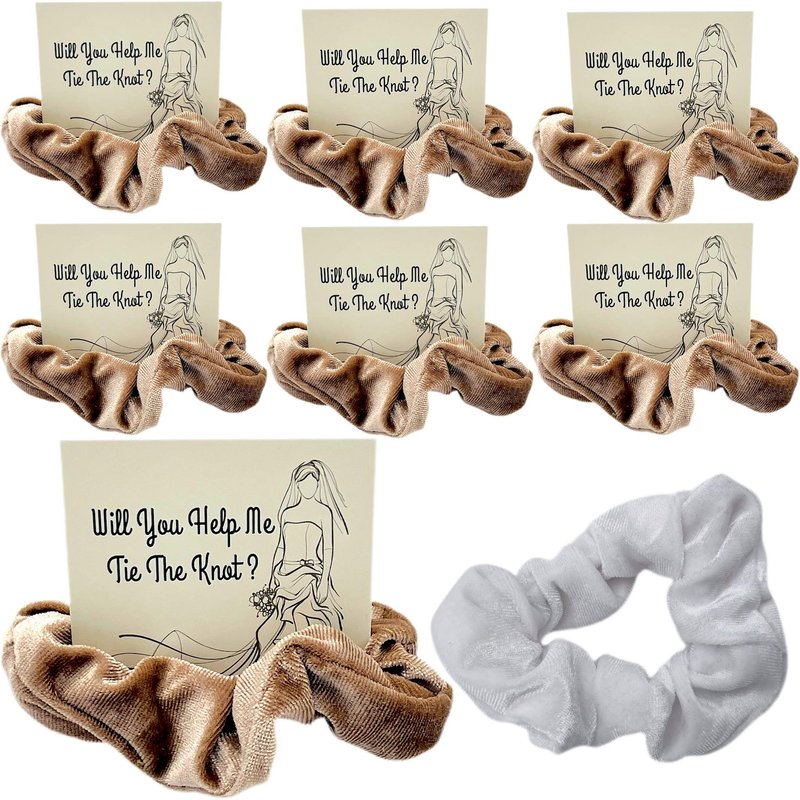 - Quality Material: quality elastic scrunchies hair ties for team bride bachelorette parties & bridal favors. Package includes 7 Scrunchies for bridesmaids, 7 dual side mini proposal card & 1 white scrunchie for the bride.