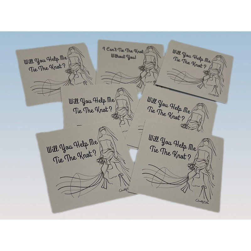 Mini proposal cards are printed on both sides with the following texts: "Will you help me tie the knot" & " I can't tie the knot without you".