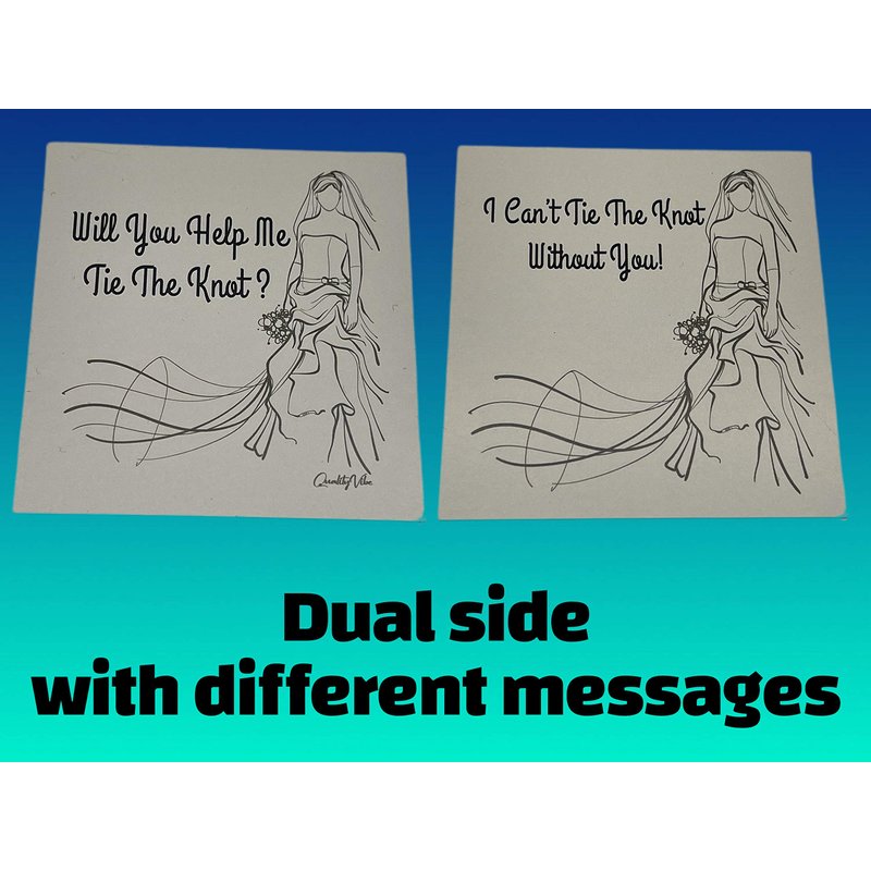 - Double Sided Quality Card: the kit comes with double sided 14 pt. thick quality proposal card with a different message on each side. "Will you help me tie the knot?" in one side & the other side has " I can't tie the knot without you." Cards stay flat when scrunchies are added.
