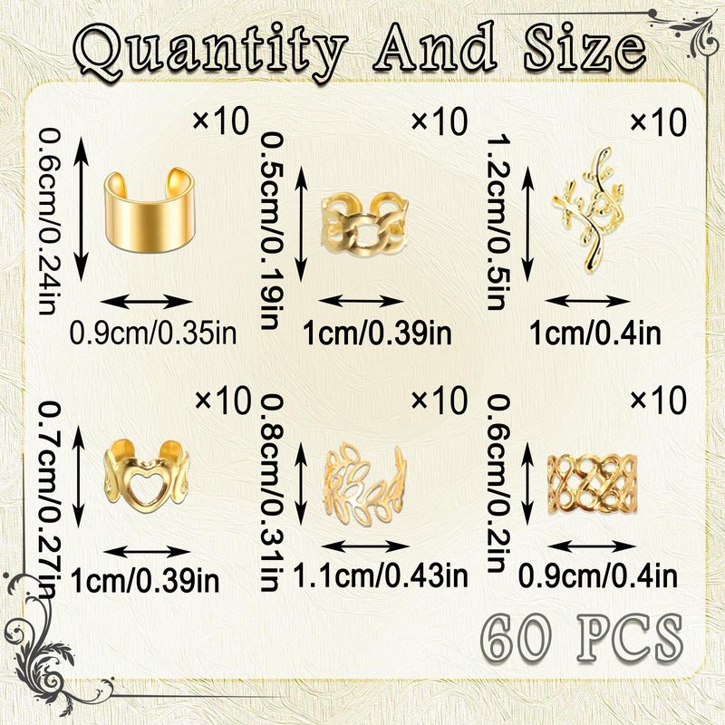 - Value Pack:One pack contains 6 different style loc cuffs, 10pcs for each style, total is 60pcs. Enough quantity and various shape design allows you to create more stylish and charming hairtype.These braids accessories can satisfy your different decorative needs.