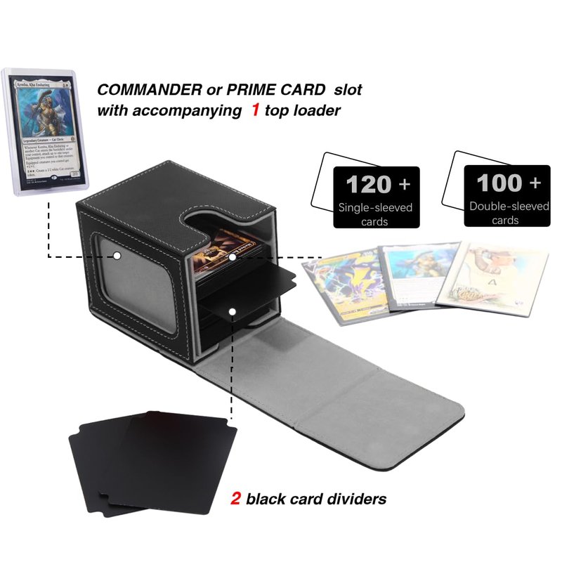 - 【Patented Design】Our innovative window design is specifically tailored for EDH Commander players and is versatile enough to accommodate Prime cards, such as Energy cards. The custom-fitted slots securely store your Commander or Prime card in the included top loader, allowing for easy identification and proud display. This unique feature ensures that you can quickly identify which deck is inside each card box.It can also prop itself up using its own lid, making it convenient for easy access.