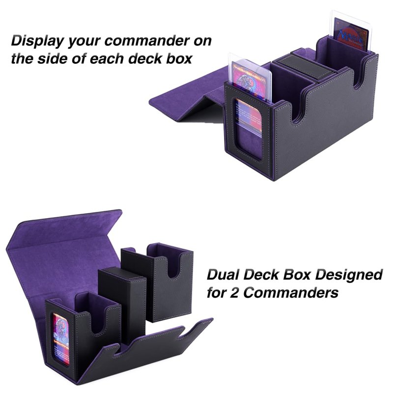 - 【Showcase Design】Our innovative deck case boasts a custom-made window design, specifically tailored for EDH Commander players, yet versatile enough for various card games. Each box features a dedicated window that securely displays two Commanders or Leader cards within the provided toploaders, facilitating easy identification and showcasing. This unique design allows you and a friend to quickly identify and select your respective decks, making it perfect for head-to-head gameplay.