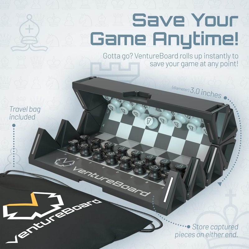 - Uniquely Designed Rolling Chess Set - Ventureboard is a unique 6-inch magnetic chess set that rolls up into a hard shell leaving the pieces in place! It unrolls from a compact shell with pieces stored in their starting positions so no set-up time is needed for chess.