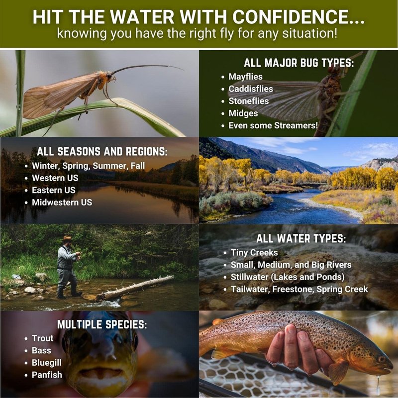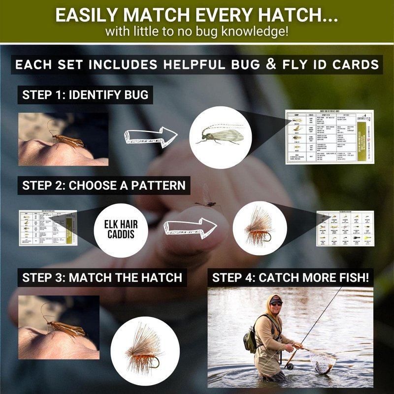 • MATCH THE HATCH - With the absolute beginner fly fisherman in mind, we’ve made this assortment super user friendly by providing each angler with helpful reference cards. You’ll be able to quickly understand what each fly looks like, which bugs they imitate, and when to use them. You’ll have the perfect recipe to “match the hatch” and catch tons of fish on all your adventures.
