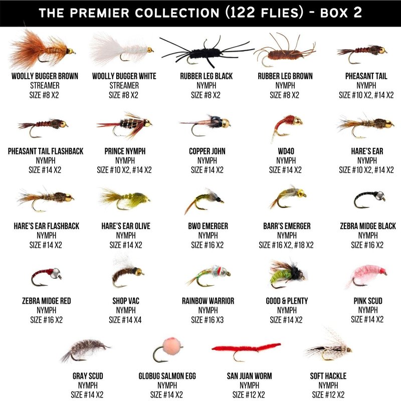 Ventures Fly Co. The Premier Collection- 122 Premium Flies, 48 different patterns, Various sizes. Two 24 compartment fly boxes, Fly Identification, Hook Sizing, and Knot Tying Guides included.
