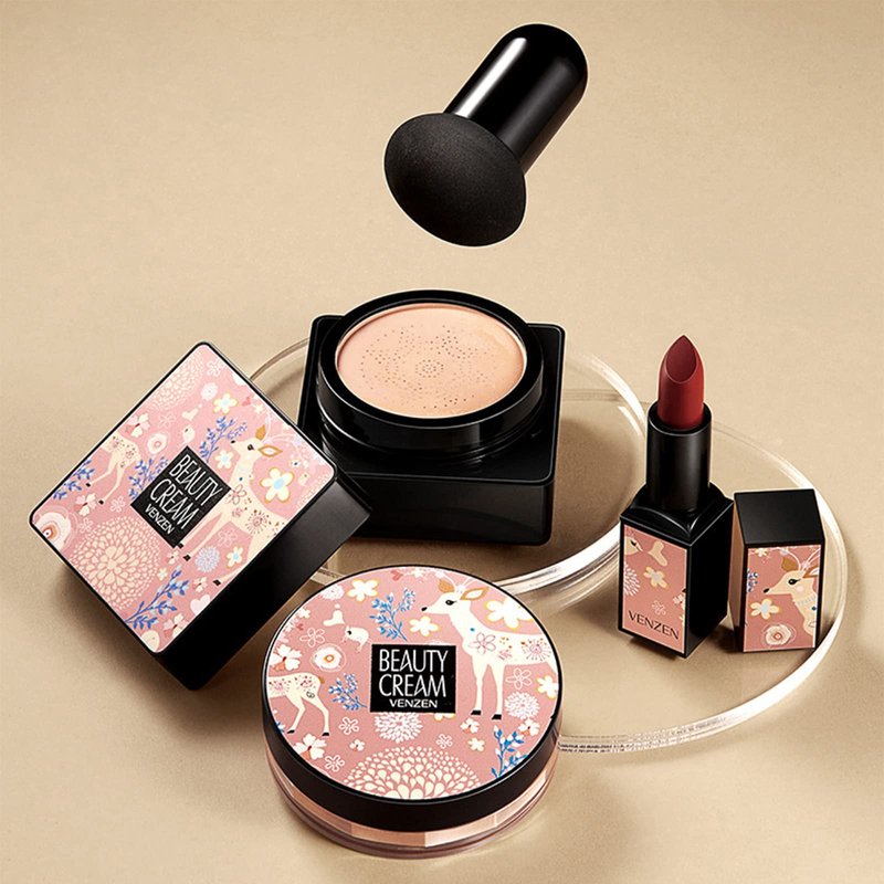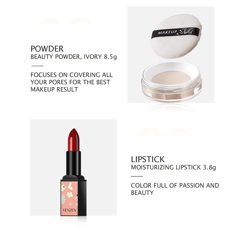 VENZEN Makeup Beauty Cream 3pcs Gift Box Carpet Flowers Colors Ivory White Foundation Powder Moisturizing Concealer Lipstick