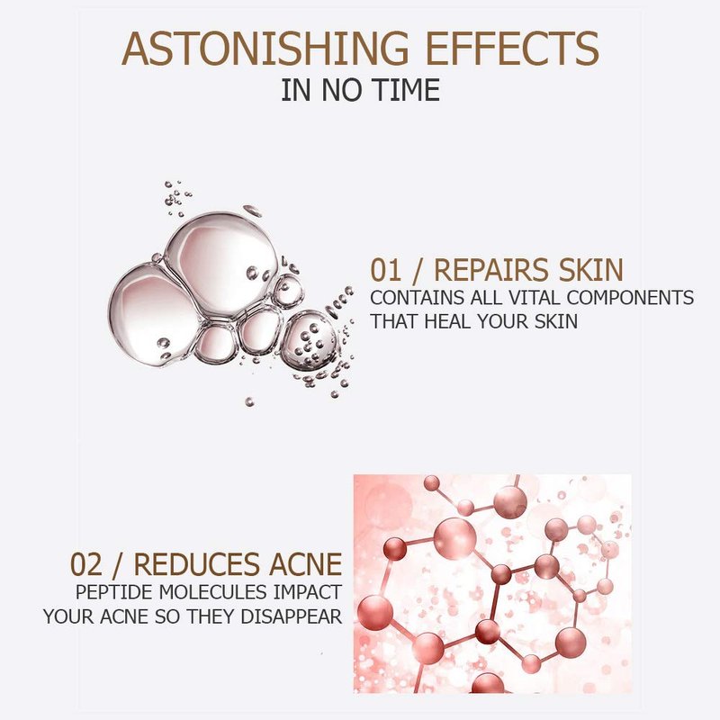 - Astonishing effects. In no time. Repairs skin. Contains all vital components that heal your skin. Reduces acne. Peptide molecules impact your acne so they disappear.
