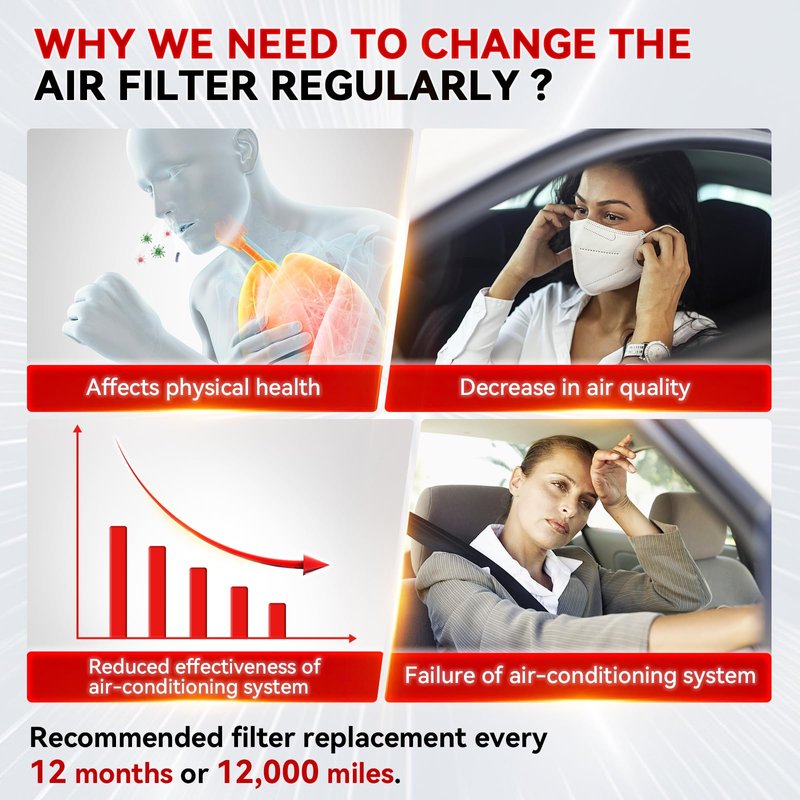 - 【Easy to Replace】 Cabin air filter replacement is easy to replace and can be changed by the driver in a few simple steps; it is recommended that cabin filter replacement be replaced every 12 months or 12,000 miles in order to maintain the air quality in the vehicle, protect the health of the driver and keep the air conditioning system functioning properly.