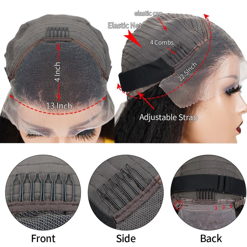 - 💕 【13×4 Kinky Straight Lace Front Wigs CAP】 Medium Size(22 Inch--22.5 Inch), Viable For Most Head Size. Glueless Human Hair Wigs with 2 Adjustable Straps & 4 combs, Easy to Adjust &Wear,Easier To Fix The Wigs. Breathable Mesh Cap, More Comfortable & Soft.