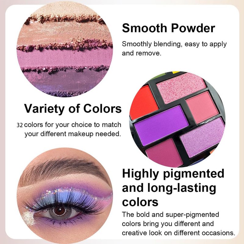 • 【High Pigmented and Cruelty-free Beauty】The all-in-one make up shadow palette includes 32 shades-smooth mattes and vibrant shimmers. The beauty set offers endless looks ranging from natural everyday look to captivating eye look. The formulated ingredients are high quality, safe and healthy, and suitable across all skin tone.