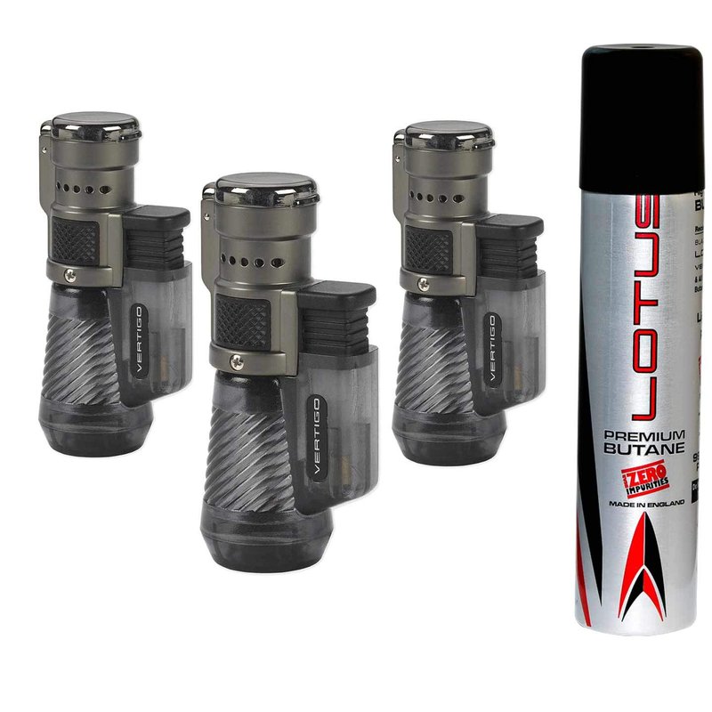 Vertigo by Lotus Cyclone Triple Torch Cigar Lighter Charcoal 3 Pack Plus 1 Lotus 90ml Butane Can