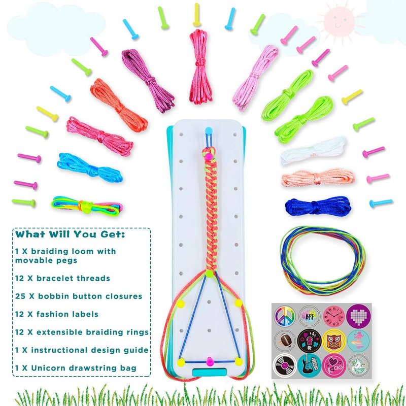 • Includes Everything You Need: 1 portable bracelet making tool, 12 bracelet threads, 12 extensible braiding rings, 12 bobbin button closures, 12 fashion pattern stickers, 1 instructional design guide, 1 unicorn storage bag.