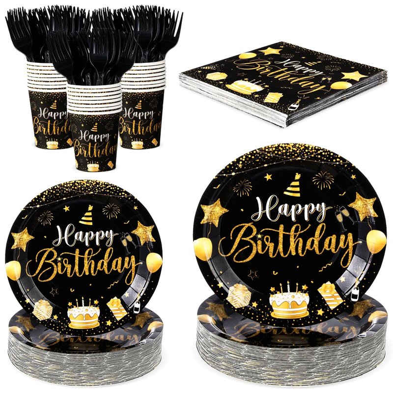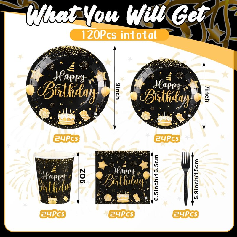 - Birthday Party Tableware Serve for 24: our birthday party black and gold tableware set includes a total of 120 pieces, including 24 each of dinner plates, desserts plates, napkins, cups, and forks, ensuring that your guests are well catered for