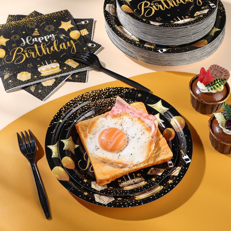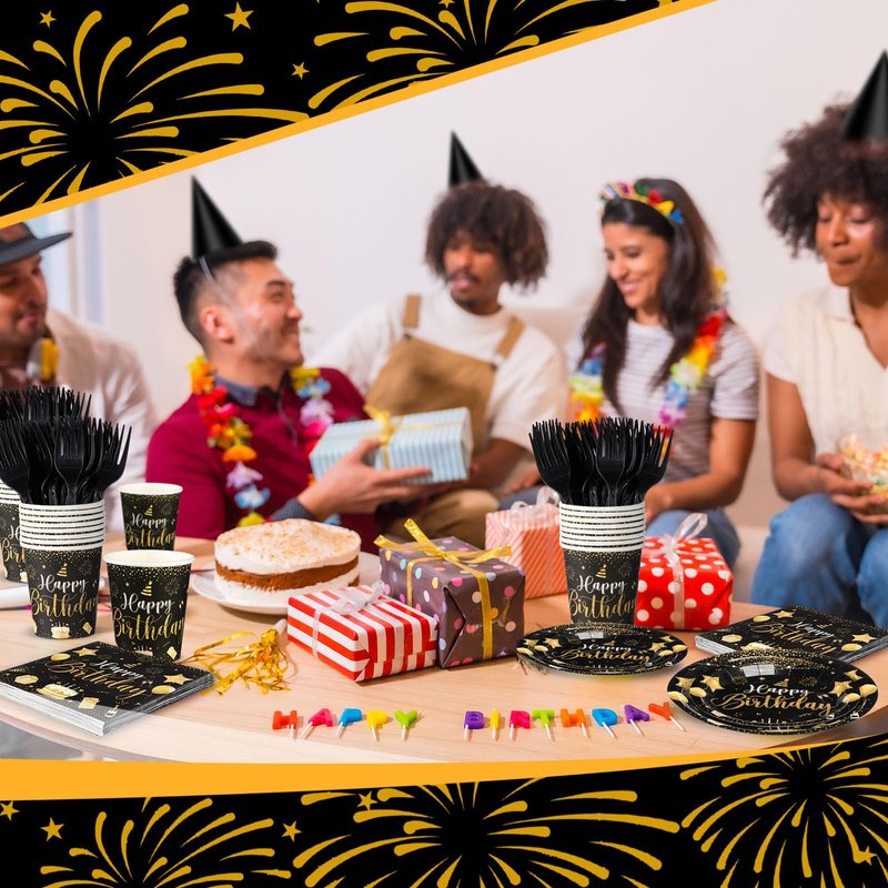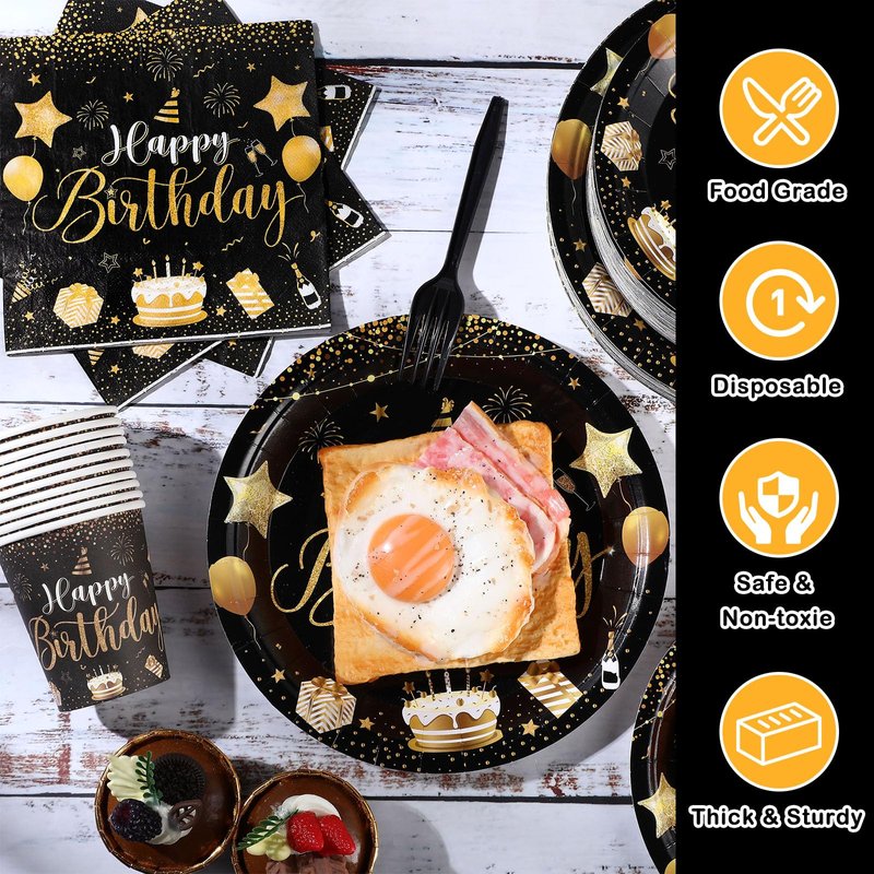 - Dependable Material Composition: made from quality and reliable materials, the birthday party tableware set ensures durability and stability; The gold and black plates are made from sturdy paper, the forks are plastic, and both the cups and napkins are quality paper material, allowing you and your guests to enjoy your meal comfortably