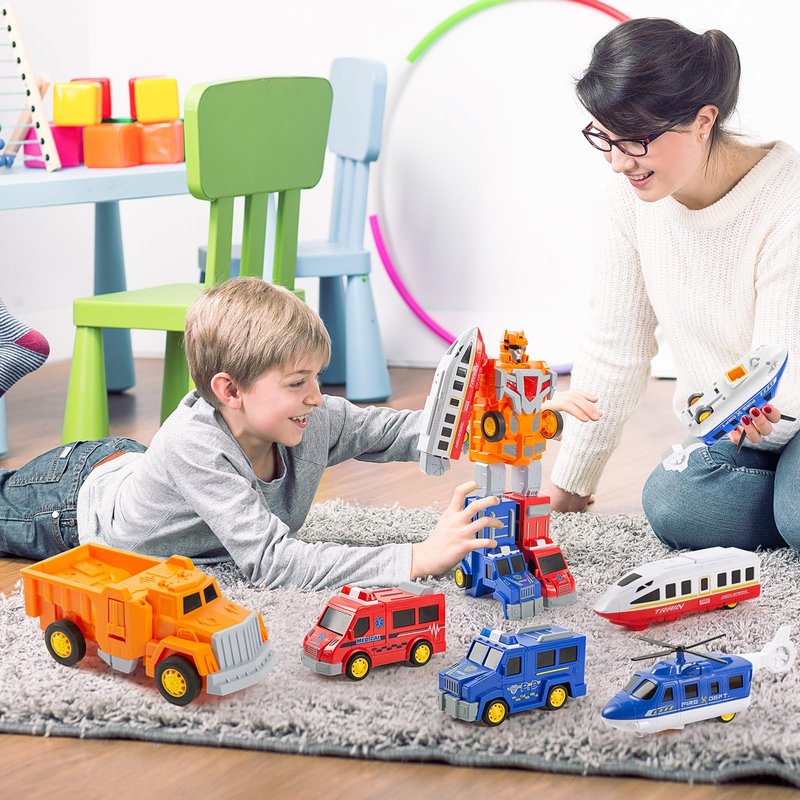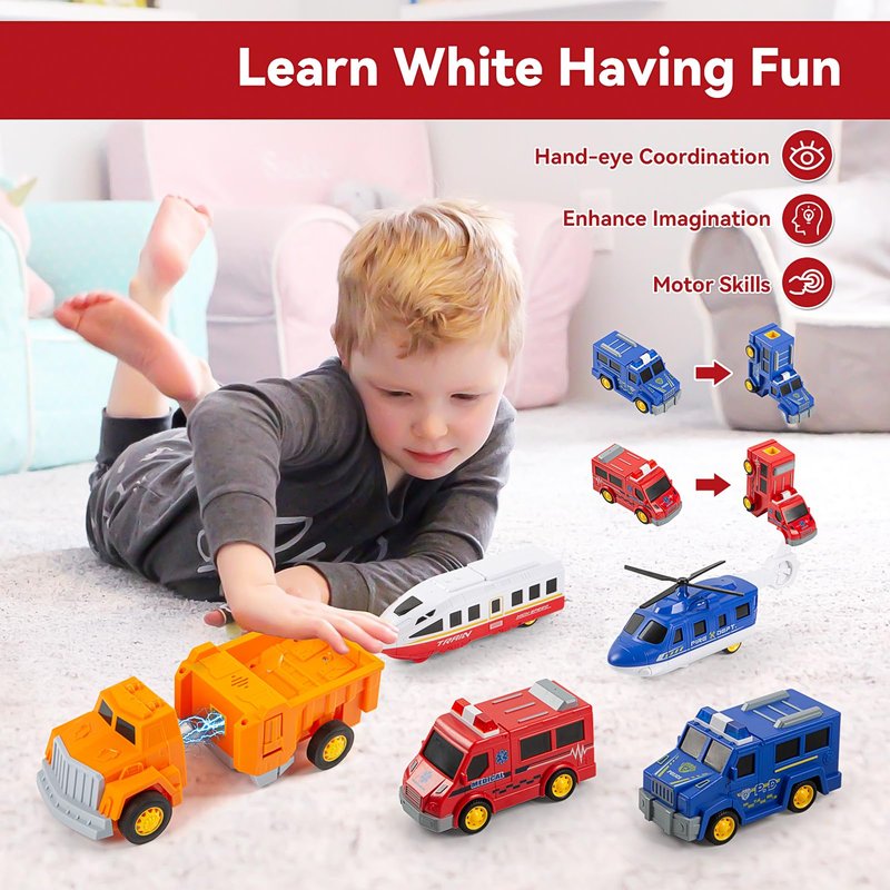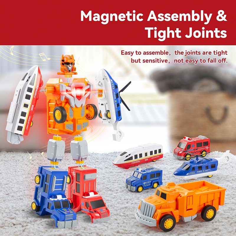 - Magnetic Assembly Robot - Each small part has magnetism and can be assembled into airplanes, police cars, ambulances, trucks and trains through magnetic points. Four types of urban transportation toy cars can be assembled into large robots. All toy trucks are made of thick and sturdy ABS material for durability. The surface has been finely and gently treated, 100% environmentally friendly and will not harm children.