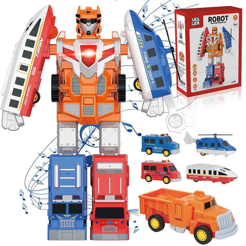 - 5-in-1 Transport Robot Toy - The robot comes with 5 pull-back vehicles (airplane, police car, ambulance, truck and train), 5 city transport toys can be assembled freely and combined into a giant robot, suitable for boys aged 3-8. City transport toys , simulate urban traffic, let children direct road traffic, and let children play the role of traffic police.