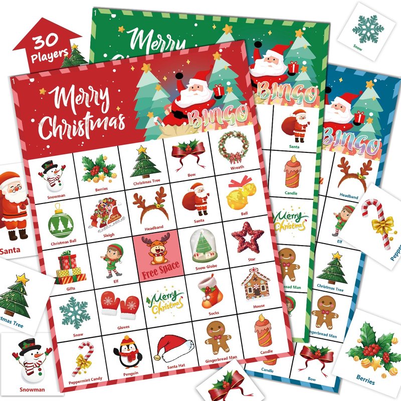 - Christmas Bingo Cards Included:30 sheets Christmas bingo player cards with 24 unique part,24PCS large calling chips,648PCS Bingo marking Chips and a manual.It can make kids adults of all ages and large groups to have a fun time in Christmas party.