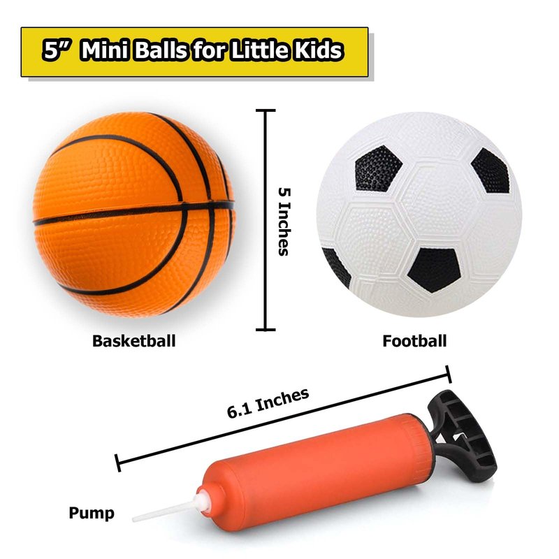 - 【Top Quality Toddler Basketball, Football And Pump, Textured Grip Design】--- These 5” toddler basketballs footballs are made of durable environmental PVC material, 100% safe for little kids playing basketball indoor and outdoor. Textured surface design make this kids basketball grip, shoot and catch easily. The air pump is made of high-grade ABS, solid and durable, designed for long-term use. (needle is in the handle)
