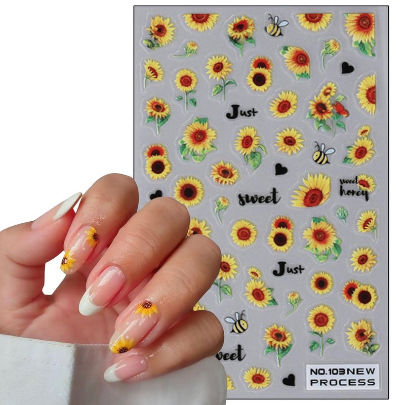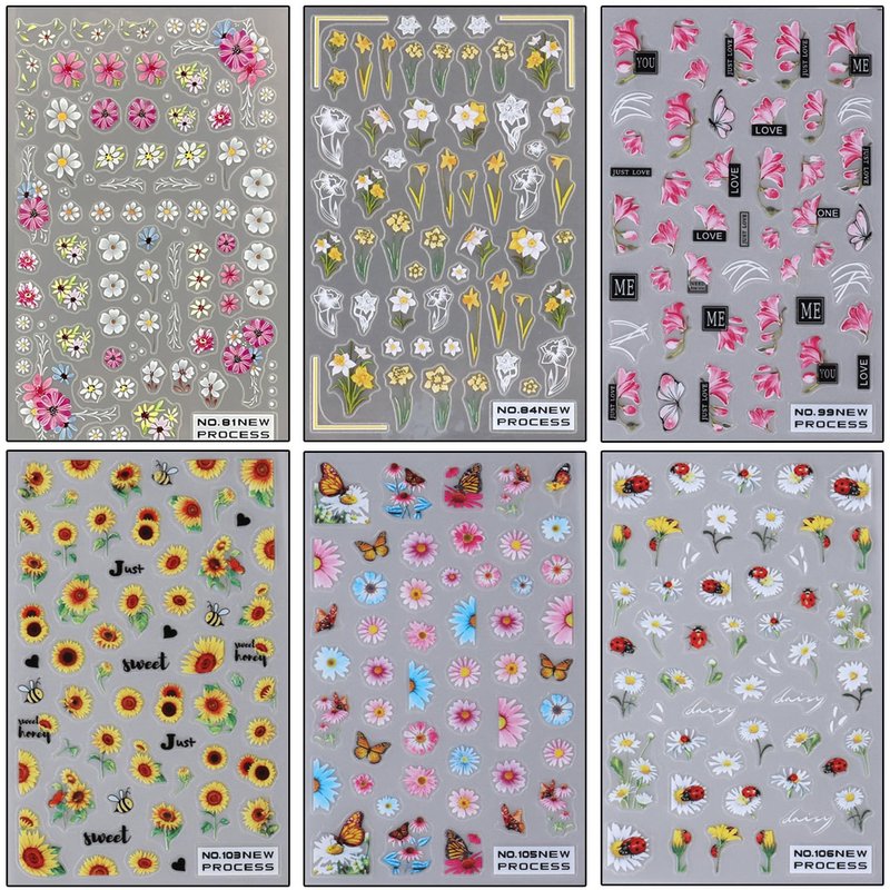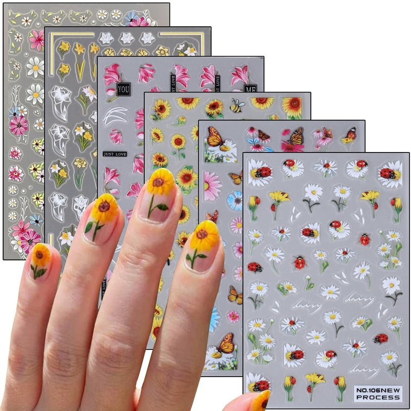- 【Quantity】You will get 6 sheets flower nail art adhesive sticker, each paper measures 4 x 2.56 inch(10 x 6.5 cm). Contains a variety of flower patterns: sunflower, white daisy, pink chrysanthemum, butterfly, etc. These floral nail stickers are perfect for matching other nail art.