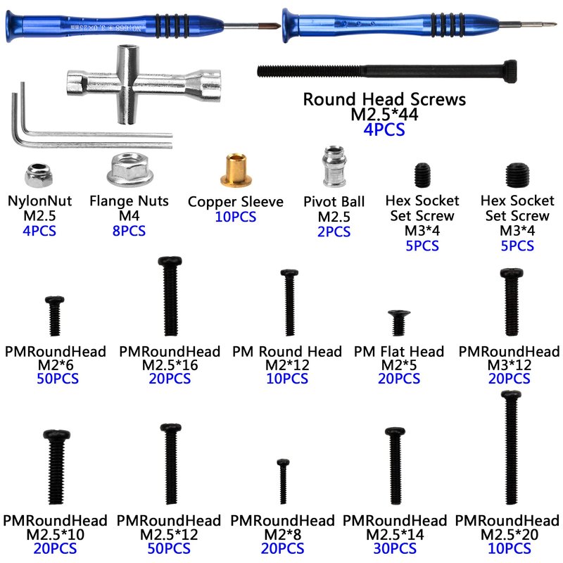 - RC screws kit in various sizes to suit your needs.M2 & M2.5 Screws, Hex Wrench, M4 Flange Nuts, Flange Nut ,M2.5 Nylon Nut &Copper Sleeve & 2.0 3.0 Cross screwdriver ...etc