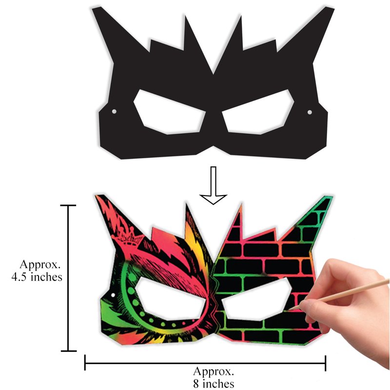 - [SCRATCH PAPER ART MASK]: Scratch Paper Art Mask Set is a creative and fun activity for kids 5 years and older. The paper is multi-colored with a black coating on top. Remove the coating with the included scratch tool to reveal stunning rainbow colors hiding beneath the surface.