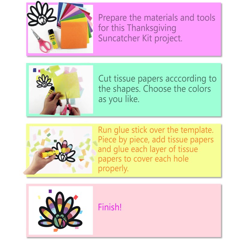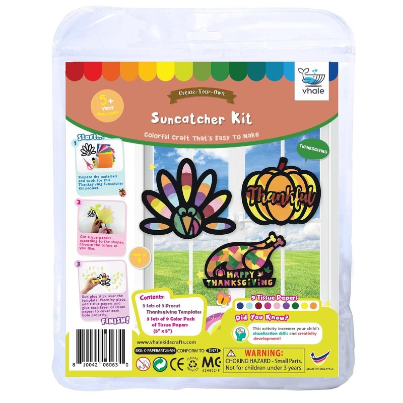 - [FEATURES] This easy and simple create your own kit contains everything needed to design and make Thanksgiving themed suncatchers. With Thanksgiving precut templates and plenty of colorful tissue paper, this suncatcher kit is guaranteed to brighten your day.